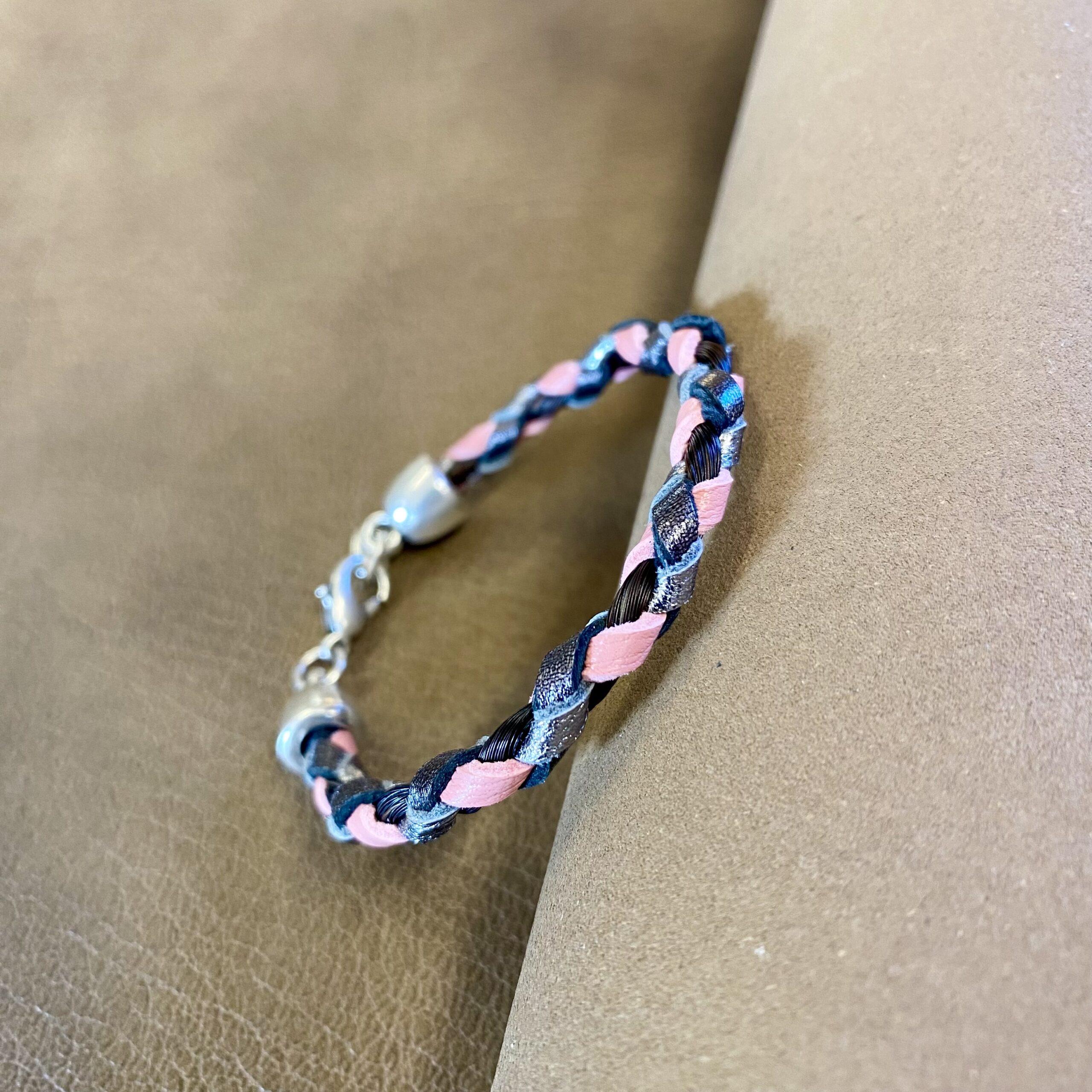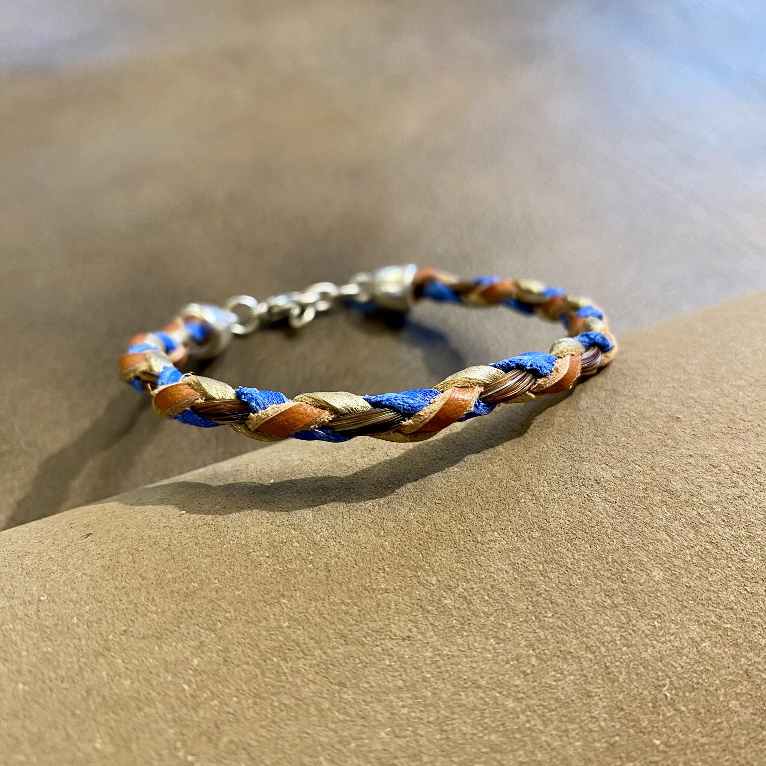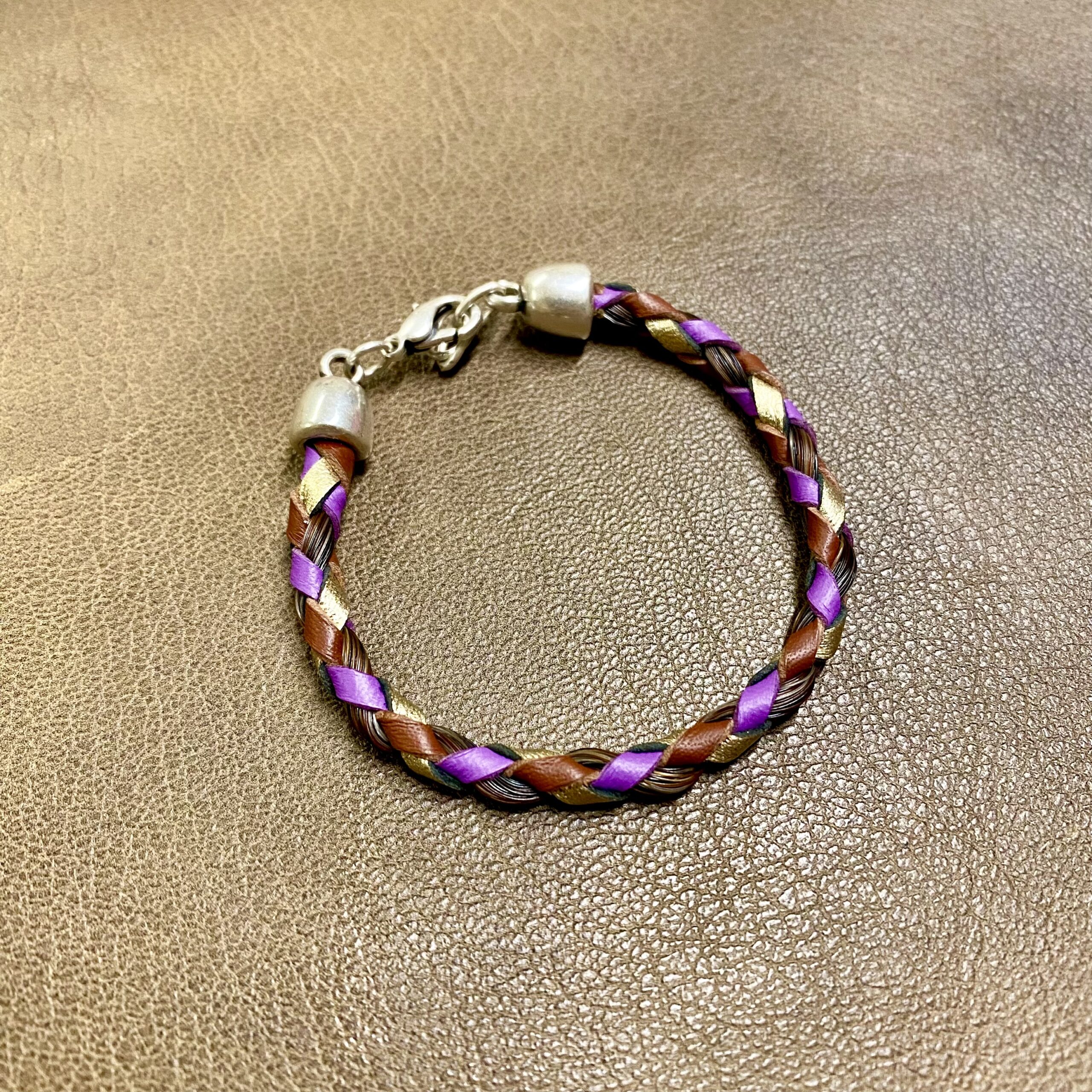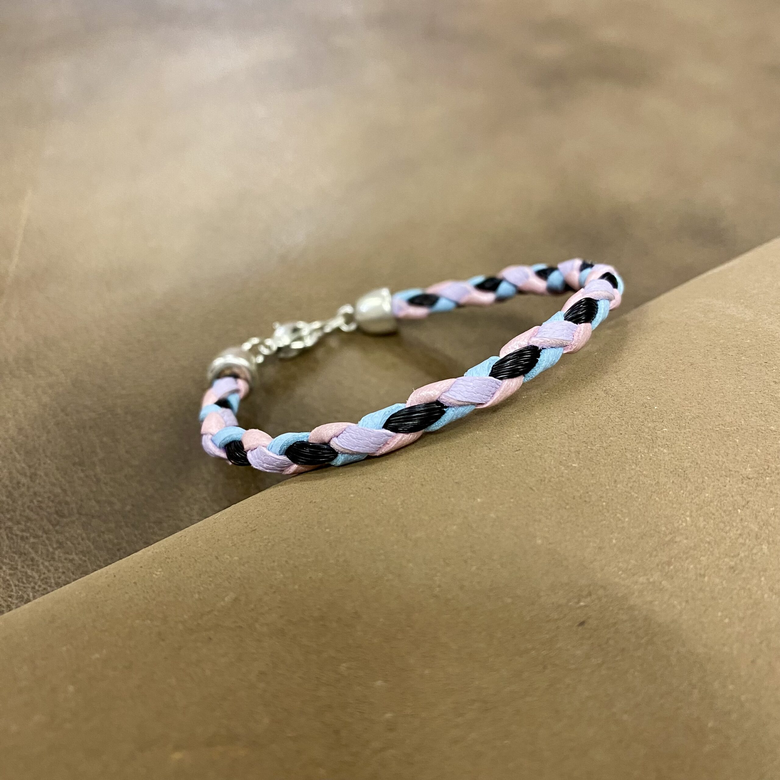 Bracelet en cuir tressé à la main, intégrant discrètement une mèche de crins de votre cheval : un bijou sobre, mais profondément personnel.